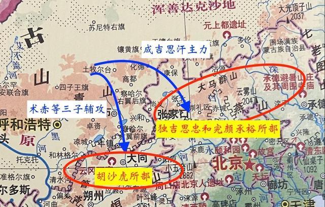 为了牵制西京的胡沙虎,成吉思汗分兵3万,交给术赤、察合台、窝阔台进攻西线。